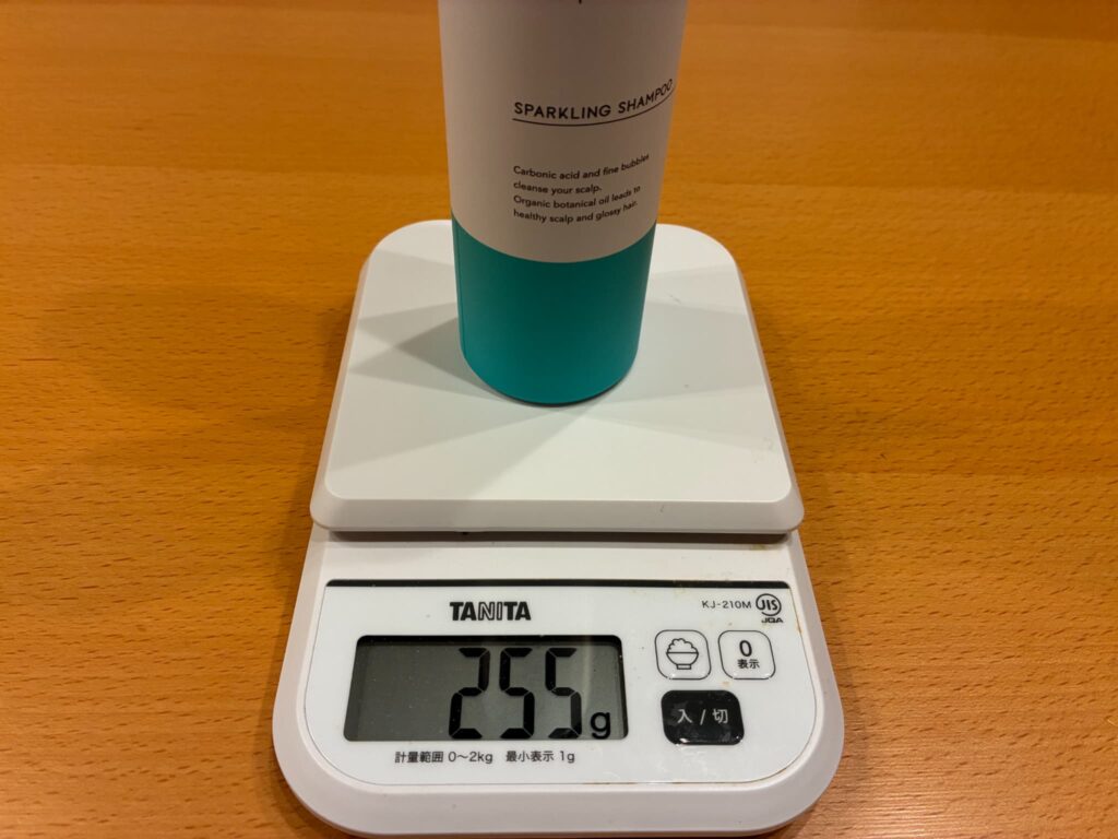 ハディエントシャンプーの重さをはかってみたところ、255gでした。